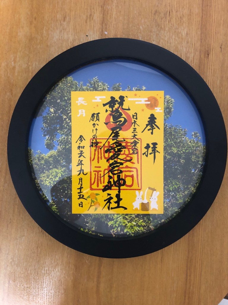 たまにはお札でも買い替え、いくらかの奉献をし、それに加えて季節限定の御朱印が目に付いたので、自室の装飾に風紀が良くなりそうとの直感で購入。しかし、ベラっと紙一枚を壁に貼るだけでは物足りないかな〜?オシャレに飾りたいと丸型の額縁もネットで注文。