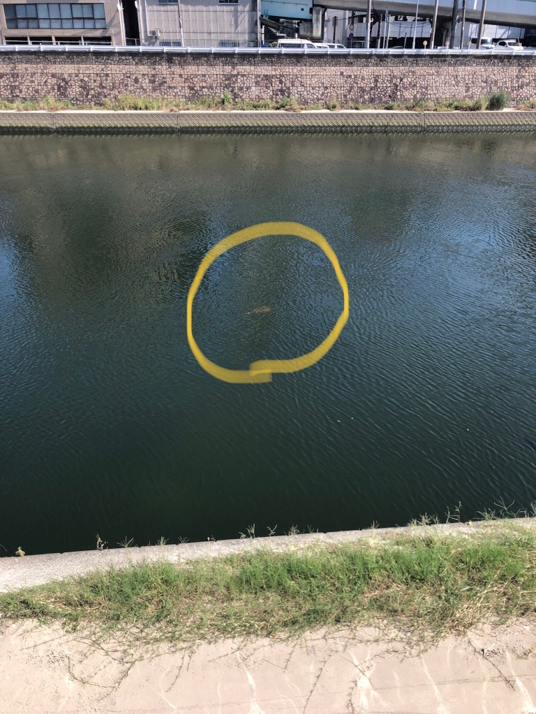 あれ?広く黄色味かかった座布団のような他の魚も泳いっているけど…ってエイだ〜。こんな街中に近い川でエイがいるとは驚き〜。それも普通は海にいるはずの魚なのに…